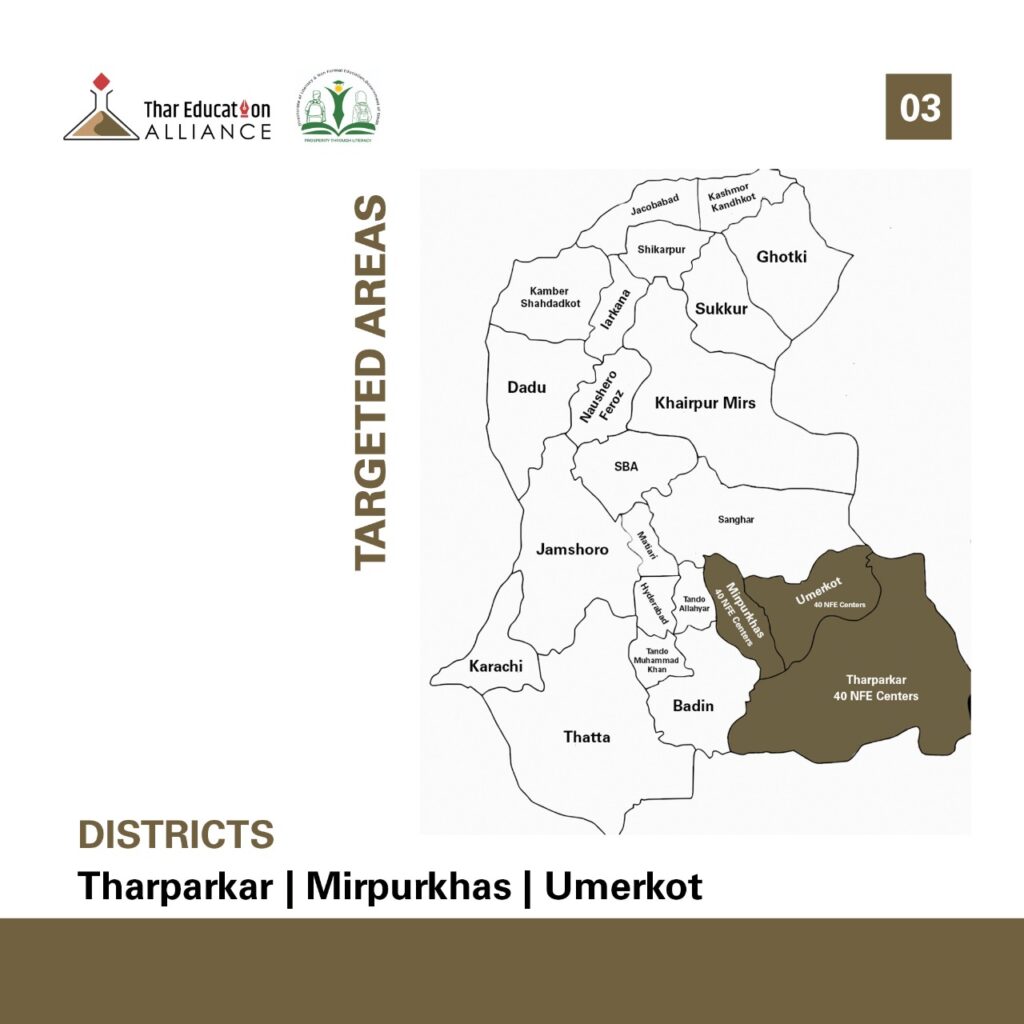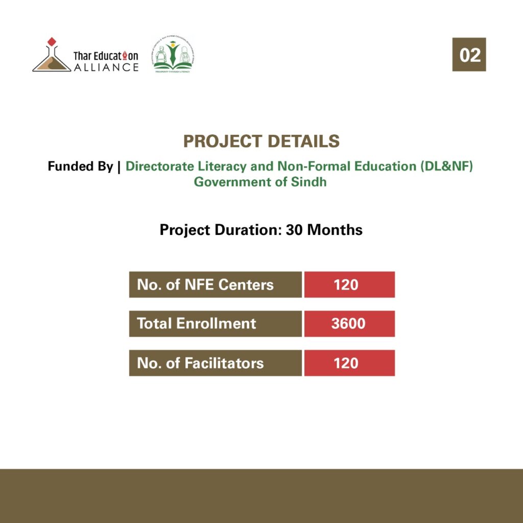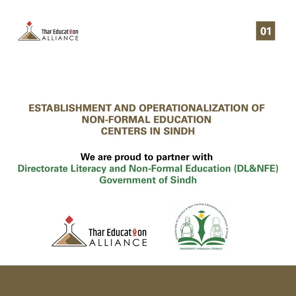 Thar Education Alliance with the support of Directorate Literacy and Non-Formal Education (DL&NFE) Government of Sindh implementing project title “Establishment and Operationalization of Non-Formal Education Centers in Sindh”. The project aims to address the critical issue of low literacy rates and limited educational access for out-of-school children (OOSC) in the underserved regions of Tharparkar, Umerkot, and Mirpurkhas. Thar Education Alliance will establish 120 Non-Formal Education (NFE) Centers to provide foundational education to 3,600 children and youth who are currently excluded from the formal schooling system. The project focuses on creating an inclusive learning environment that delivers basic literacy, numeracy, and essential life skills, empowering learners for better future opportunities and facilitating their potential transition into formal education.